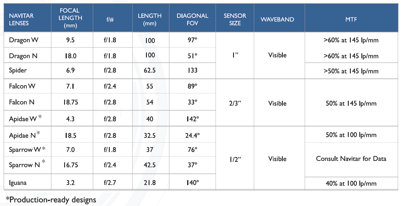Navitar has developed a family of high resolution lenses for demanding imaging applications such as unmanned aerial vehicles (UAV) and autonomous vehicle (AV) forward-facing camera systems. Multiple fields of view are offered for 1/2", 2/3" and 1" sensor formats.