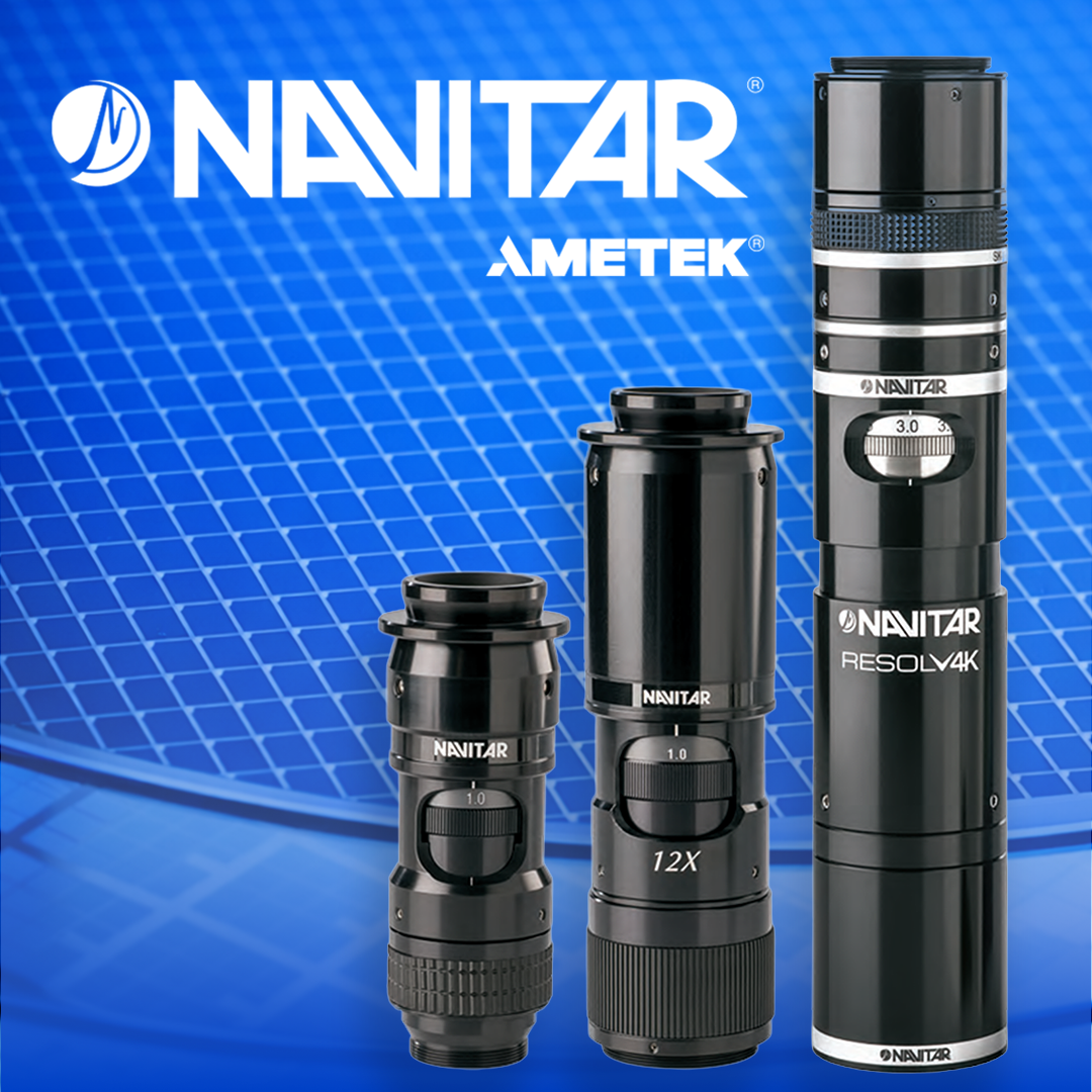 A flexible optical platform reduces redesign risk and keeps your imaging stack relevant as processes, parts, and sensor formats evolve. For example, the Navitar Resolv4k® Lens Series provides high flexibility. The low mag end of the zoom gives wide fields of view with no sacrifice in MTF or loss of illumination, while the high mag end delivers microscope objective like resolution at extremely long working distances.